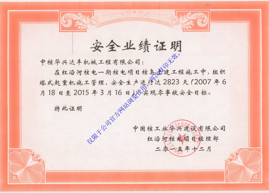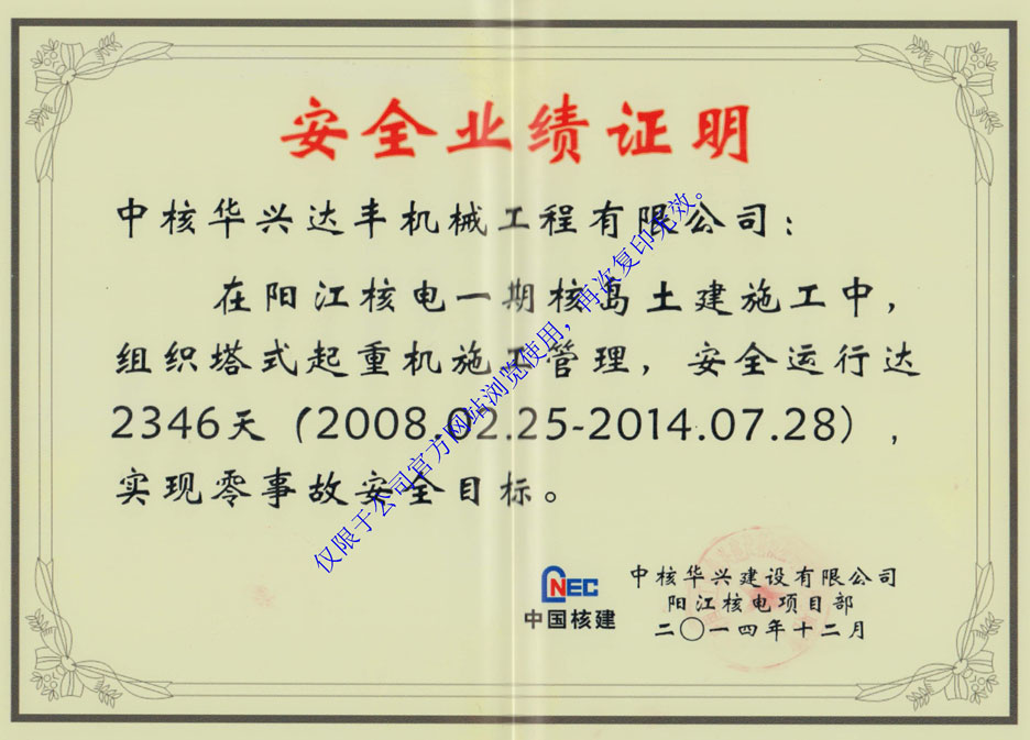 安全業(yè)績證明(陽江核電一期核島土建施工)