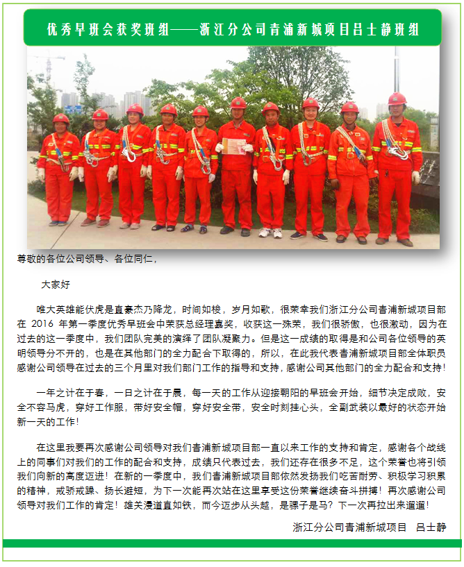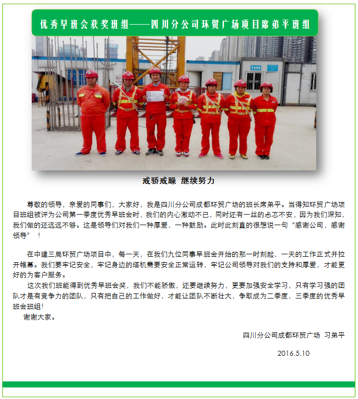 2016年4月底,經(jīng)過一系列的篩選和考查,四川分公司環(huán)貿(mào)廣場項(xiàng)目席弟平班組和浙江分公司青浦新城項(xiàng)目呂士靜班組獲得了本屆“優(yōu)秀早班會班組”榮譽(yù),并榮獲“總經(jīng)理嘉獎”!5月初,總經(jīng)辦及勞動力資源部代表分別前往兩個項(xiàng)目對這兩個班組進(jìn)行授獎。