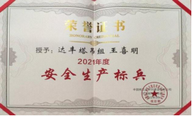 王喜明被中國(guó)核工業(yè)華興建設(shè)有限公司評(píng)為:“2021年度安全生產(chǎn)標(biāo)兵”