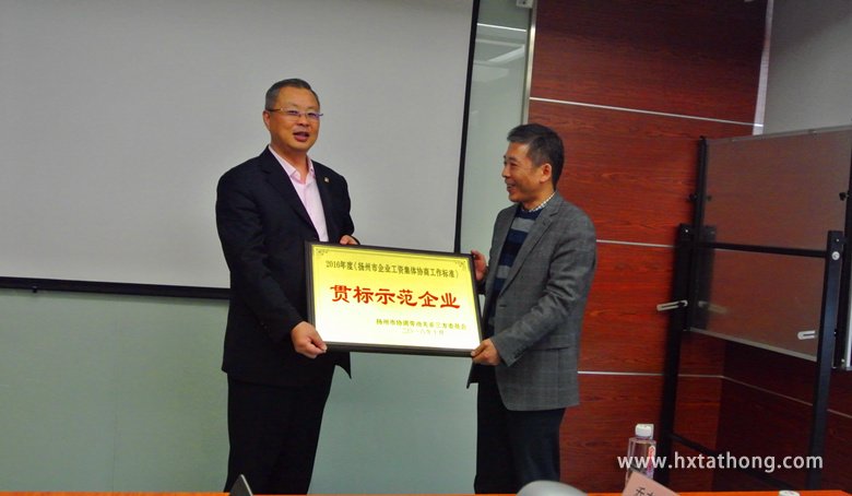 交流會議上,我司總經(jīng)理朱輝代表公司熱烈歡迎儀征市總工會李勇主席一行人的到訪,并感謝市總工會領(lǐng)導(dǎo)及各企業(yè)工會領(lǐng)導(dǎo)的來訪交流。首先,李勇主席代表揚州市協(xié)調(diào)勞動關(guān)系三方委員會向我司頒發(fā)“2016年度《揚州市企業(yè)工資集體協(xié)商工作標(biāo)準(zhǔn)》貫標(biāo)示范企業(yè)”獎牌。此項稱號,是我司積極配合揚州市協(xié)調(diào)勞動關(guān)系三方委員會及總工會認(rèn)真學(xué)習(xí)、執(zhí)行《揚州市企業(yè)工資集體協(xié)商工作標(biāo)準(zhǔn)》并順利通過貫徹認(rèn)證而獲得的。中核華興達(dá)豐機械工程有限公司是儀征市獲得此稱號的三家單位之一。