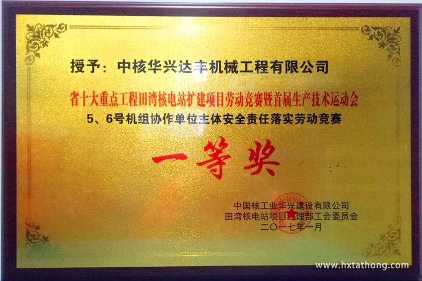 2017年1中旬,中核華興建設(shè)有限公司田灣核電項(xiàng)目部召開江蘇省重點(diǎn)工程田核擴(kuò)建項(xiàng)目勞動(dòng)競賽暨首屆生產(chǎn)技術(shù)運(yùn)動(dòng)會(huì)表彰大會(huì)。表彰大會(huì)上,中核華興達(dá)豐機(jī)械工程有限公司被授予“省十大重點(diǎn)工程田灣核電站擴(kuò)建項(xiàng)目勞動(dòng)競賽暨首屆生產(chǎn)技術(shù)運(yùn)動(dòng)會(huì)5、6號(hào)機(jī)組協(xié)作單位主體安全責(zé)任落實(shí)勞動(dòng)競賽一等獎(jiǎng)”榮譽(yù)!