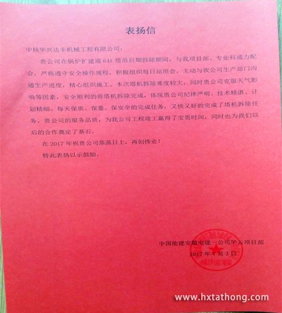 2017年7月3日,在中核華興達豐四川分公司包頭云電廠項目人員的通力合作下,我們安全順利地完成了中國能建安徽電建一公司包頭華云電廠項目S1200M64塔機的拆卸任務。由于我司人員的出色表現(xiàn),現(xiàn)場班組獲得甲方頒發(fā)的“技術精益求精、服務盡心盡責”錦旗和表揚信。