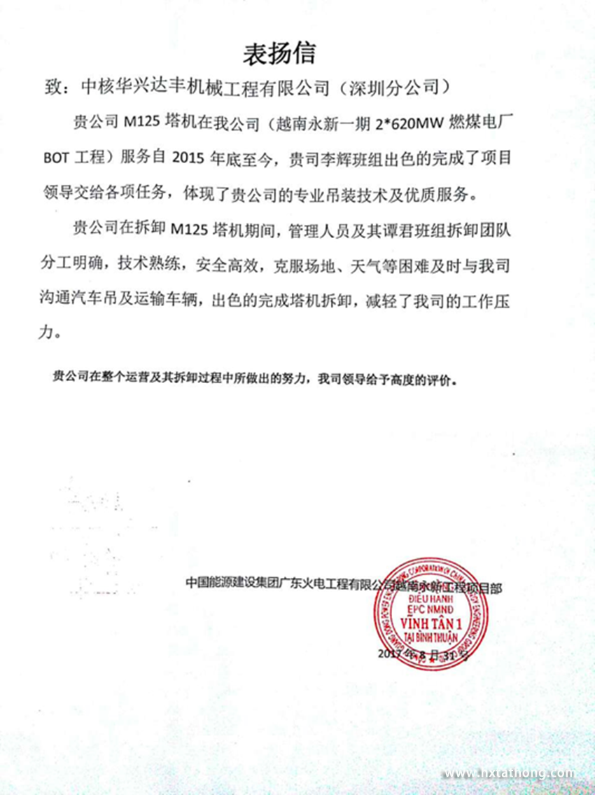 中國能源局集團廣東火電工程有限公司越南永新工程項目部(甲方)為我司頒發(fā)的表揚信