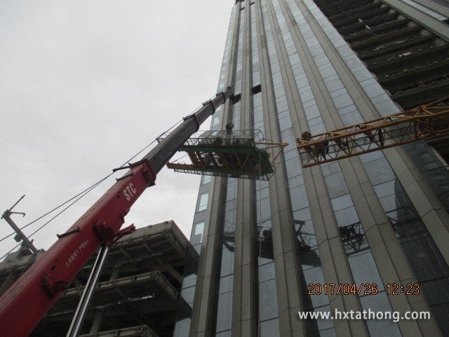 由于施工原因,該塔機(jī)安裝由5道正式附著和過程中的1道16米撐桿臨時(shí)交替附著。隨著工程的推進(jìn),最后一臺(tái)塔機(jī)也于2017年4月16日正式報(bào)停,陜西一建集團(tuán)現(xiàn)場(chǎng)項(xiàng)目部及業(yè)主要求我司10天內(nèi)全部拆除并運(yùn)輸完畢。由于該塔安裝使用時(shí)間長(zhǎng),且現(xiàn)場(chǎng)場(chǎng)地受限,降節(jié)的部附件必須在當(dāng)天運(yùn)輸出去,而且主體多半幕墻已安裝完成,稍有不慎就有可能碰到幕墻。這些都給拆除帶來很大的困難和風(fēng)險(xiǎn)。