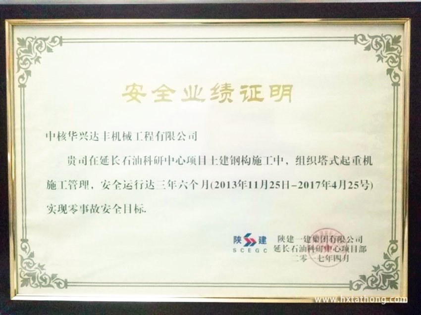 甲方項(xiàng)目經(jīng)理對(duì)中核華興達(dá)豐在該項(xiàng)目的整體運(yùn)行服務(wù)予以高度評(píng)價(jià),認(rèn)為我司的表現(xiàn)超出了他們的預(yù)期,為項(xiàng)目的垂直運(yùn)輸以及項(xiàng)目主體的順利完工做出了巨大的貢獻(xiàn)。“服務(wù)精細(xì)、客戶至上,安全第一、值得信賴”是陜西一建集團(tuán)公司對(duì)我司陜西延長(zhǎng)石油科研中心項(xiàng)目服務(wù)的最高評(píng)價(jià)。甲方授予我司的安全業(yè)績(jī)證明上寫著 “中核華興達(dá)豐機(jī)械工程有限公司在延長(zhǎng)石油科技中心項(xiàng)目土建鋼構(gòu)施工中,組織塔式起重機(jī)施工管理,安全運(yùn)行達(dá)三年六個(gè)月(2013年11月25日-2017年4月25日)實(shí)現(xiàn)零事故安全目標(biāo)”,這對(duì)于我司來說是一種無上的榮耀!這是一種榮譽(yù),也是對(duì)該項(xiàng)目中每一個(gè)工作人員長(zhǎng)達(dá)三年零六個(gè)月辛勤付出的肯定,同時(shí)是我司嚴(yán)抓安全管理的成果,是我司“厚德、安全、卓越”核心理念以及“以匠人之心、做品質(zhì)服務(wù)”經(jīng)營(yíng)理念的體現(xiàn)!未來,我們將再接再厲,為每一位中核華興達(dá)豐的合作伙伴提供的優(yōu)質(zhì)服務(wù)。